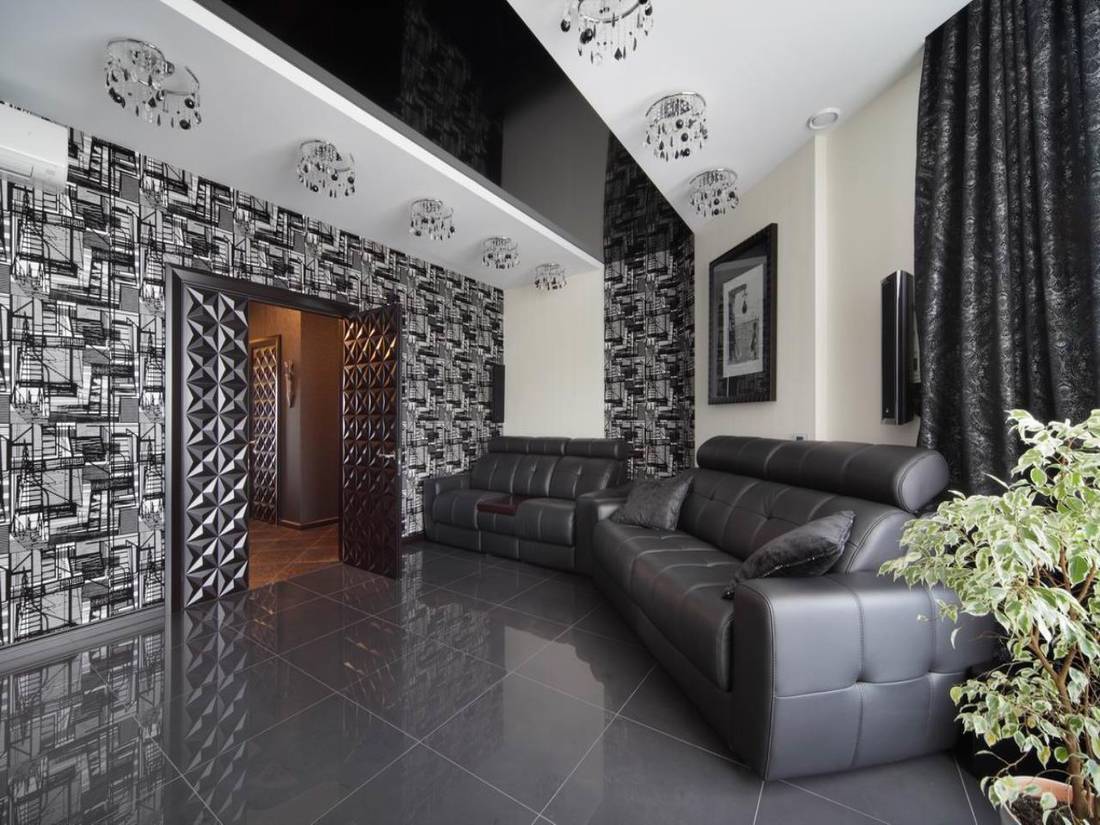 Черный цвет также может быть использован для оформления потолка, но при этом есть один нюанс – примените черный глянец. Поверхность в этом случае будет бликовать, отражая свет. Такое решение смотрится довольно эффектно. Оно привнесет в обстановку нотку загадочности и роскоши.