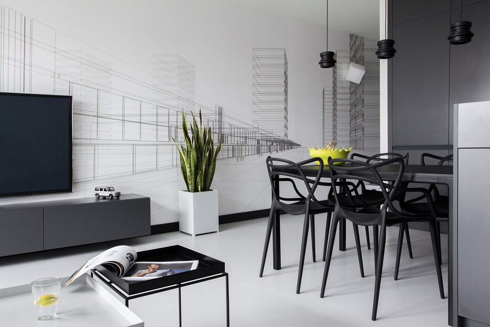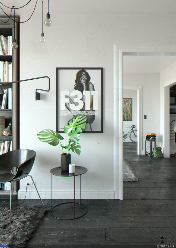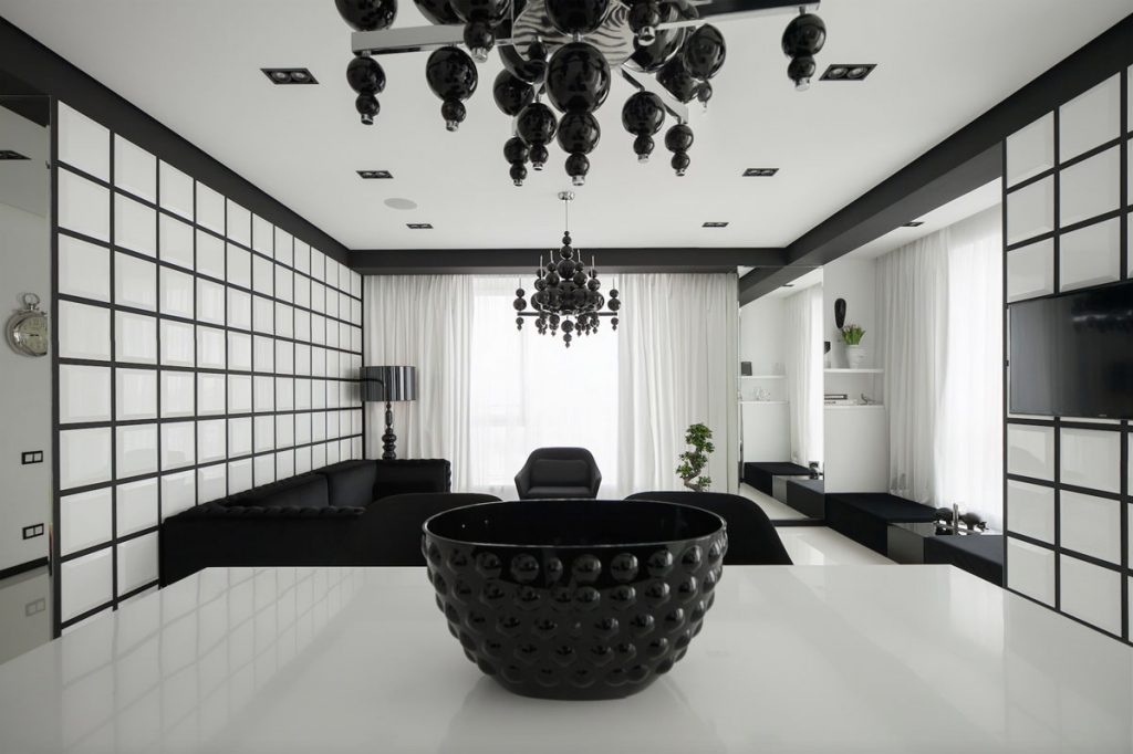 Элементы оформления интерьера также должны вписываться в общую концепцию. Используйте черные и белые вазоны, статуэтки и картины в черно-белой гамме. Отличным решением будут черно-белые настенные гравюры, выполненные карандашом. Поскольку интерьер является монохроматическим, аксессуары и детали делают сильный акцент. Кому не нравятся необычные подвесные лампы? Они могут быть черные или белые, типа больших шаров из нитей, свисающих с потолка. Такой дизайн очень впечатляет и никого не оставит равнодушным.