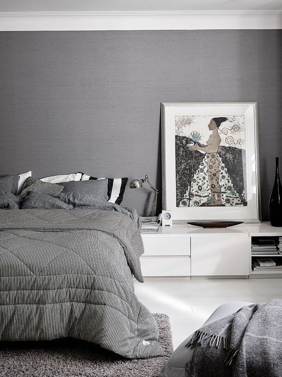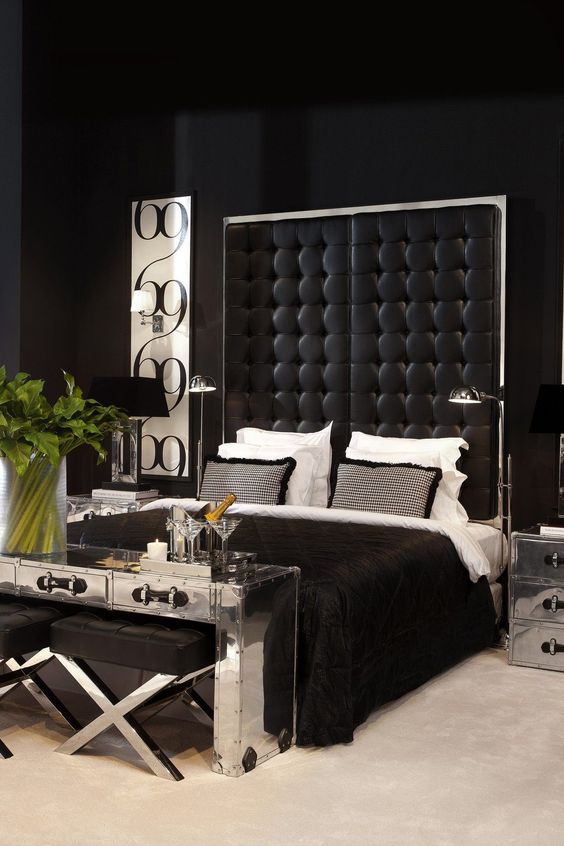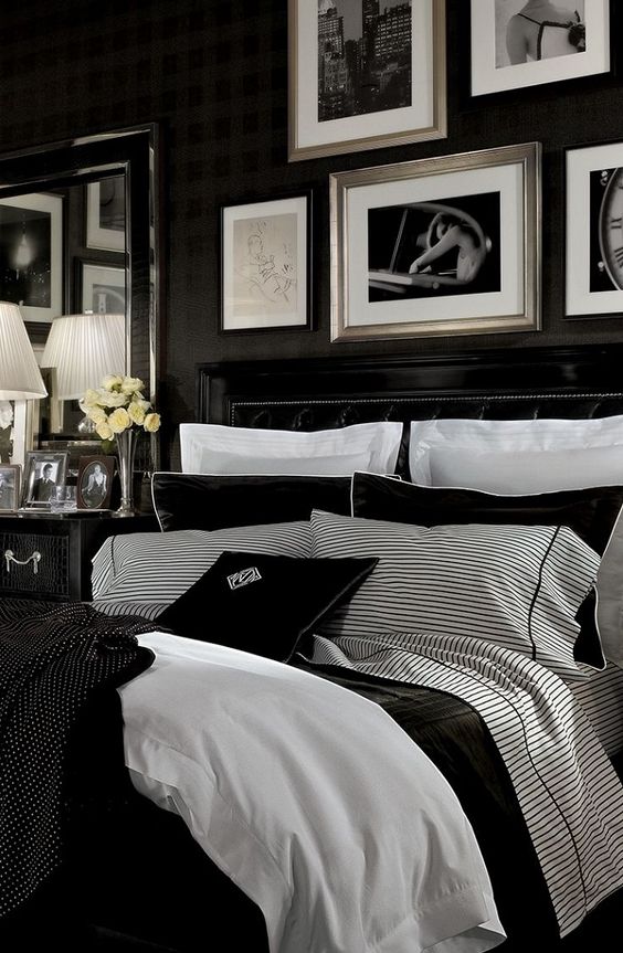 В спальне черный цвет выглядит интимно. Кроме того, последние исследования показали, что именно в полной темноте человек может иметь крепкий полноценный сон и получить по-настоящему хороший отдых. В маленькой комнате черно-белое решение интерьера будет оригинальным. Если стены оформить черным цветом, кровать обязательно должна быть белой. Подобный дизайн подходит для людей, ценящих оригинальность. В такой спальне необходимо хорошее освещение. Если вы не готовы на кардинальные перемены, попробуйте для начала купить черно-белый комплект спального белья.