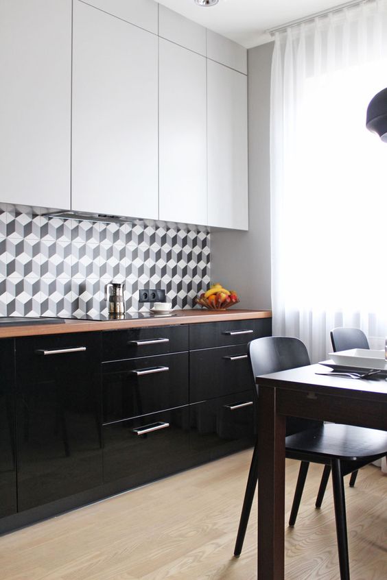 Белая кухня с белыми стенами без яркости за счет гардин и штор и скатерти будет выглядеть уныло и однообразно. Дизайнеры называют соотношение 80 % к 20% (черный: белый) самым удачным. Сочетание белого с черным на кухне удивит каждого гостя, зашедшего к вам. Монохромность позволяет достичь потрясающего эффекта. Главное – знать всему меру! Для того чтобы помещение смотрелось эффектно, подберите хорошее искусственное освещение.